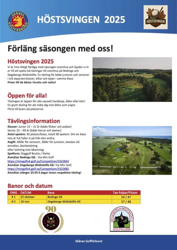 Förläng säsongen med oss! Spela 2 tävlingar nu under hösten. Första rundan på Bedinge GK 25/10 och andra på Degeberga-Widtsköfle den 16/11! Anmälan via Min Golf på hemsidan skgf.se/hostsvingen/ ... See MoreSee Less